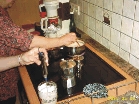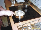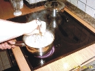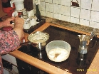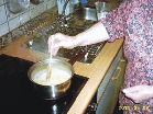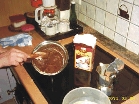 Das ganze unter ständigem Rühren vorsichtig aufkochen. Die Creme von der Kochstelle nehmen und nach belieben einen Teil mit Schokopulver vermischen. Creme abkühlen lassen.