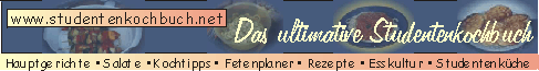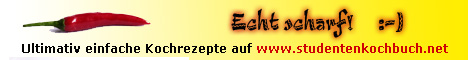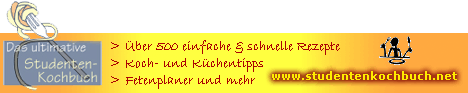Textvorschläge für Kurzbeschreibungen 1) Ein voller Bauch studiert auch gern … In Cat's ultimativem Studentenkochbuch findet man Rezepte für Salate, Vorspeisen, kleine Gerichte bis hin zu Hauptspeisen, Partyrezepten und dem „Süßen danach“. Von Studenten – oder denen, die ein Herz für Studenten haben – für Studenten erprobt, gesammelt, ins Netz gestellt. 2) Kein Plan, was Ihr essen sollt? Mensa zu? Geld (fast) alle? ... In Cat’s ultimativem Studentenkochbuch findet Ihr Vorspeisen, Salate, Hauptgerichte, Desserts, Partyrezepte und mehr... schnell, einfach und dem chronischen Geldmangel studentischer Portemonnaies angemessen :-) 3) Keinen Plan, was Ihr essen sollt? Mensa zu? Geld (fast) alle? ... In Cat's ultimativem Studentenkochbuch gibt's unkomplizierte und schnelle Rezepte für die Studentenküche! 4) Immer nur Mensaessen ist nicht das wahre und Mamas Herd weit weg ... warum nicht einmal selbst kochen? Im ultimativen Studentenkochbuch ist bestimmt etwas dabei! Einfach und schnell. 5) Das Kochbuch für genau diejenigen, die wenig Geld in der Tasche, viel Hunger im Bauch und keine Lust auf Dauernudeln haben. In Cat’s ultimativem Studentenkochbuch gibt es Rezepte, die unkompliziert sind, wenig kosten und meist schnell gehen … von kleinen Gerichten und Vorspeisen über Hauptgerichte, Salate bis hin zum „Süßen danach“. Und wem das immer noch nicht reicht, der kann vor, während oder nach dem Essen ein bisschen in den Linktipps schmökern, sich Informationen, Zitate und Sprichwörter rund um’s Essen und Trinken holen oder selbst ein Rezept für’s Kochbuch schreiben. 6) Unkompliziertes und gutes Essen aus der eigenen Studentenküche zum kleinen Preis. Zusammengestellt von Cat. 7) Einfach mal zum Löffel greifen ... Schnelle und einfache Rezepte für's Studentenleben und auch danach gibt's im ultimativen Studentenkochbuch. 8) Unkomplizierte, preiswerte und schnelle Rezepte für das Studentenleben und danach :-)... Rezepte für Süsses und Herzhaftes, aber auch kulinarische Weisheiten und Wissenswertes rund um's Essen und Trinken. 9) Das Studentenkochbuch beinhaltet Rezepte, die fast alle schnell gehen, unkompliziert sind und wenig kosten. Daher sind sie nicht nur für Studenten, sondern auch für Kinder und Jugendliche oder weitere Zielgruppen geeignet. Logo für das ultimative Studentenkochbuch von Cat