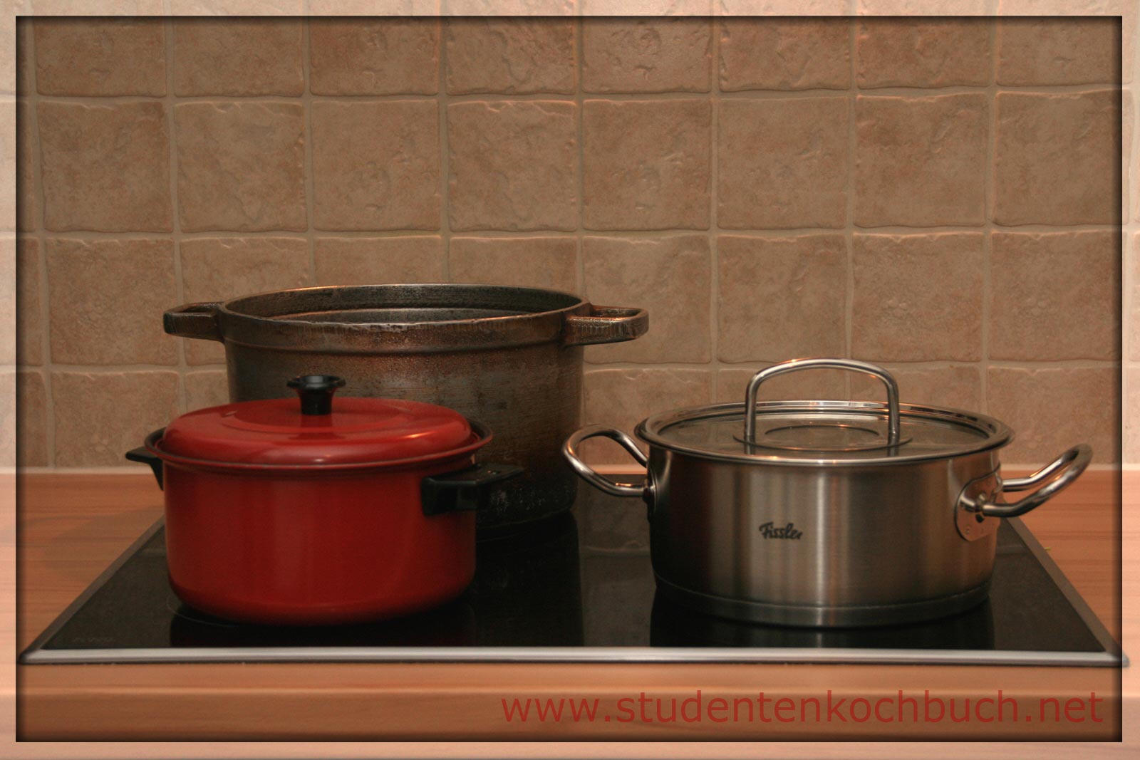 bei einem Topf an? Es gibt große und kleine, welche aus Edelstahl, welche aus Kupfer, welche aus Aluminium oder aus Blech, mit Henkeln oder mit Stiel. Doch was macht eigentlich einen guten Topf aus? Und welche braucht man wirklich in der (studentischen) Küche? Wie viele Töpfe? Im Studentenwohnheim hatte ich nur 2 Töpfe: einen großen für Nudeln und einen kleinen für die passende Soße dazu. Doch schon wenn man mal etwas mit Gemüse kochen will, stößt man da an Grenzen. Drei Töpfe sollten es also schon sein, wenn man man ein kleines Menü kochen möchte. Also empfehle ich mindestens 3 Töpfe - einen großen mit Deckel für Nudeln, Reis und Co. (in den auch mal eine Suppe für mehrere Leute hineinpasst), dann einen mittleren für Gemüse und einen kleinen für Soße. Kleine Topfkunde - wofür nimmt man welchen Topf? Brauch' ich das alles? Welches Material/ welche Qualität?